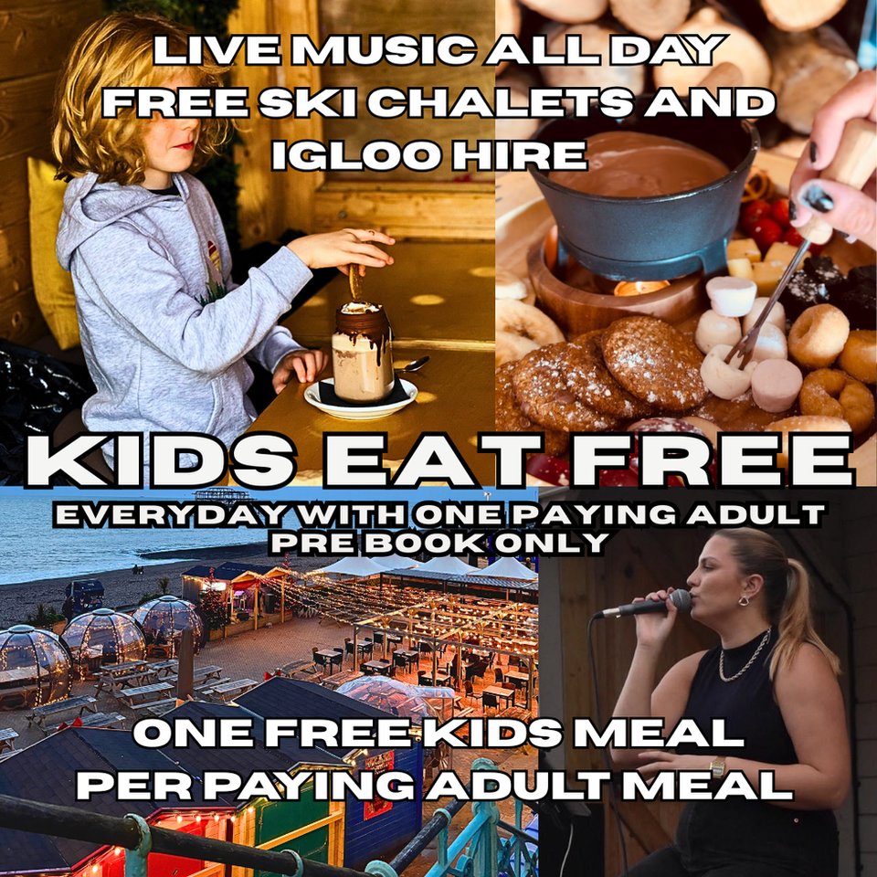 We boast the largest beach terrace in the UK, with covered spaces and FREE to hire private heated Igloos and Ski Chalets, with the option to add karaoke to your Ski Chalet booking on request.